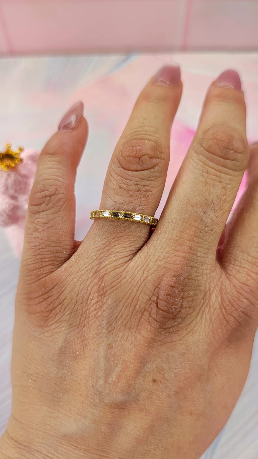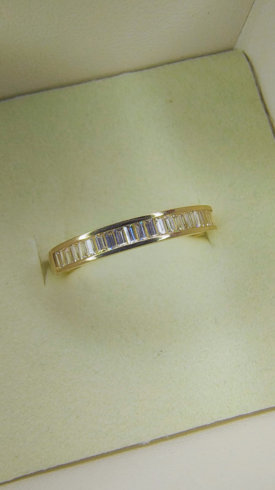 Este elegante anillo de baguette vertical en Oro de 10k pesa 1.9 gramos en una talla 8. Su diseño refinado y peso ligero lo hacen perfecto para el uso diario, agregando un toque de lujo a cualquier atuendo. Hecho con Oro de 10k, este anillo es duradero y resistente al desgaste, asegurando su belleza por años.
