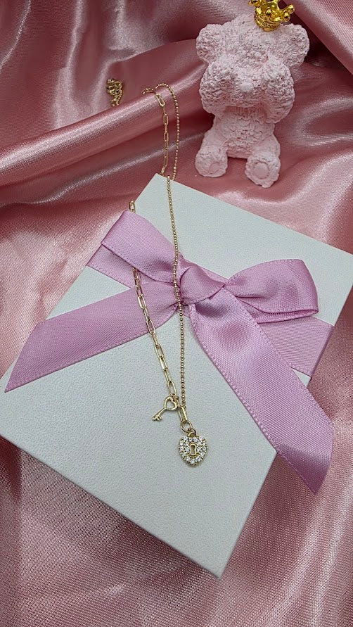 Elegante gargantilla de oro 10K con dije en forma de corazón candado, engastado con piedras de circonia que brillan con distinción. Con una longitud de 45 cm y un peso de 2.6 gramos. El diseño sofisticado del candado añade un toque romántico y simbólico, perfecto para ocasiones especiales o como accesorio diario que ref5leja tu estilo refinado.