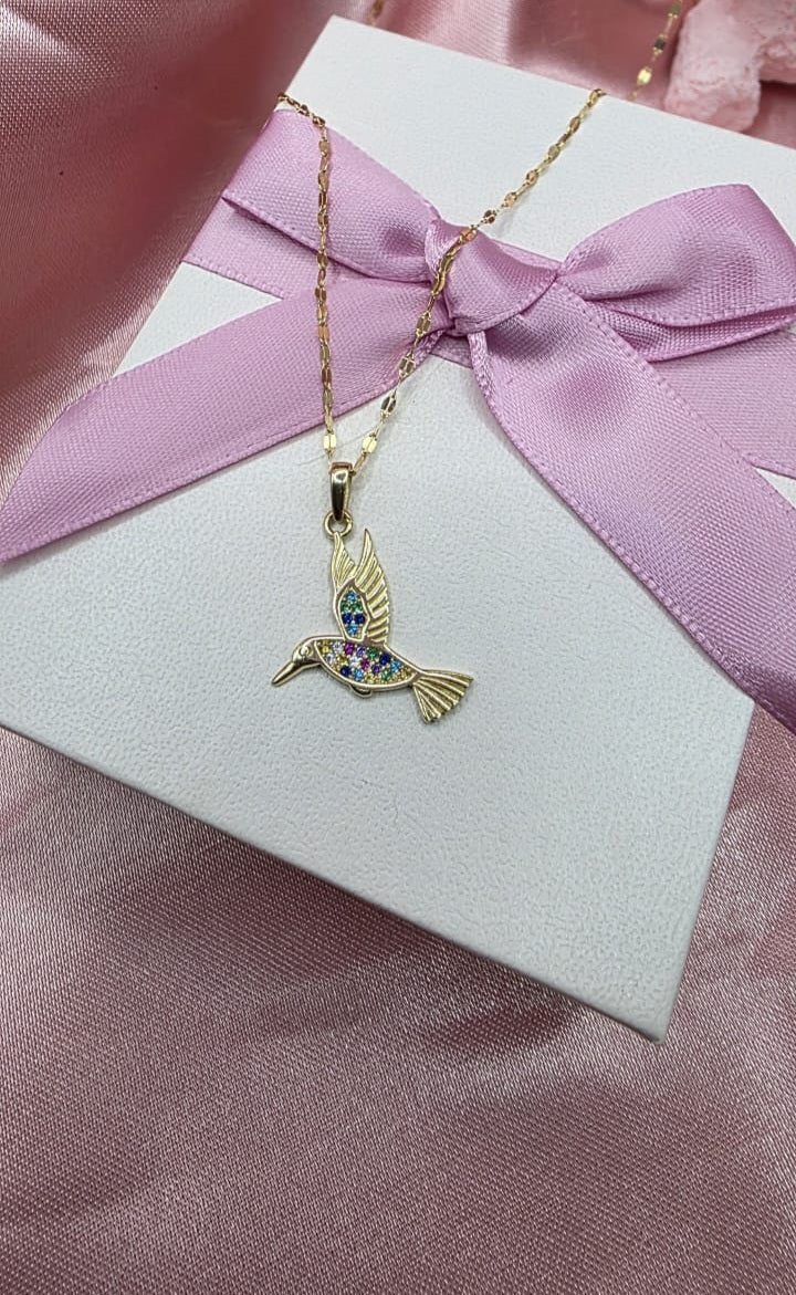 Esta gargantilla Colibrí en oro de 10k, con un peso de 1.8 gramos y una longitud de 45 cm, combina delicadeza y resistencia. Su diseño multicolor destaca con elegancia, haciendo de esta pieza un accesorio versátil ideal para cualquier ocasión que requiera un toque distintivo y sofisticado.