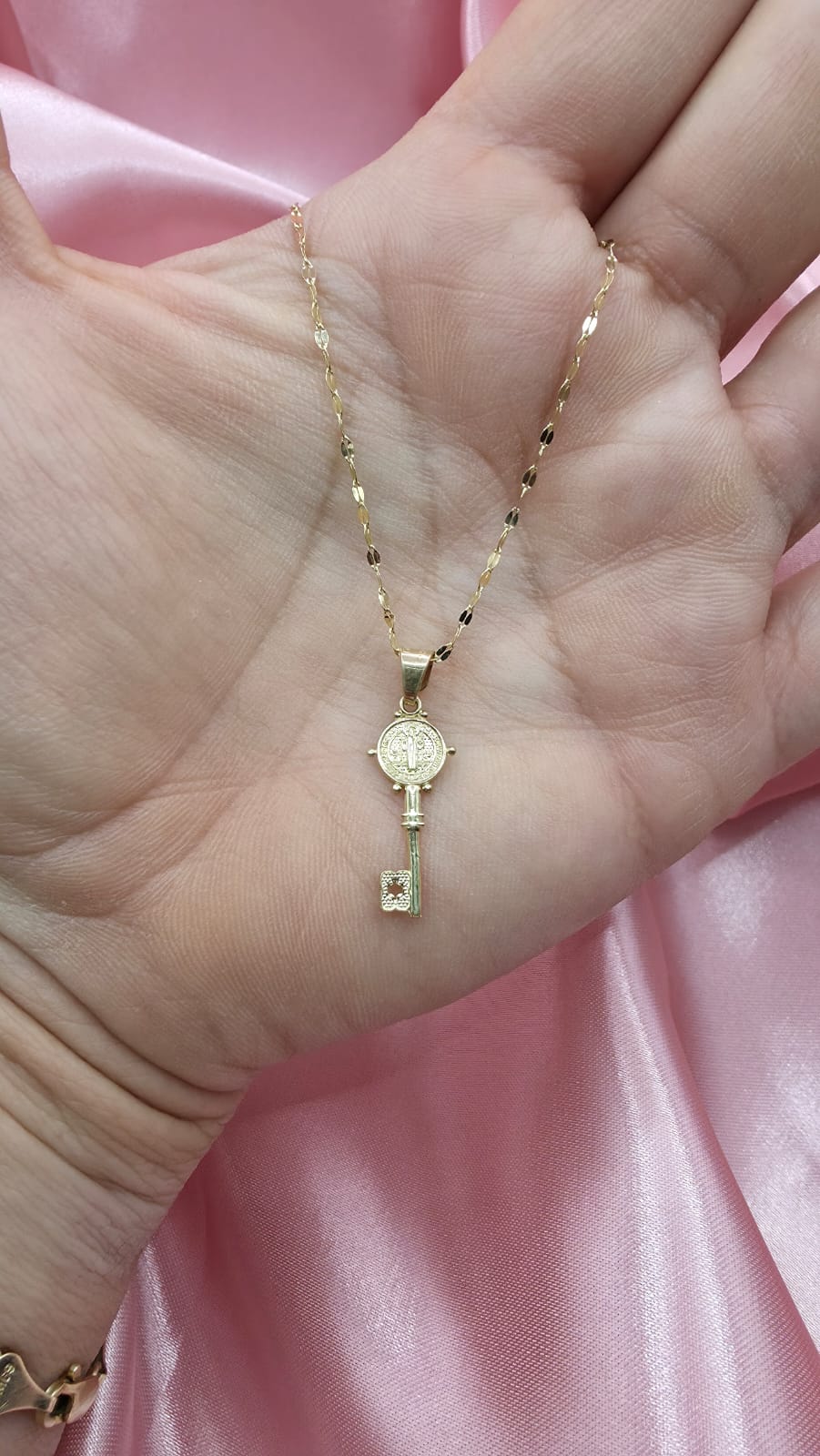 Esta elegante gargantilla presenta un colgante en forma de llave con el símbolo de San Benito, elaborado en oro de 10 quilates. Con una longitud de 45 cm, ofrece un diseño sofisticado y significativo, ideal para quienes buscan una pieza con valor espiritual y estilo refinado. Perfecta para uso diario o como un detalle especial en ocasiones importantes.