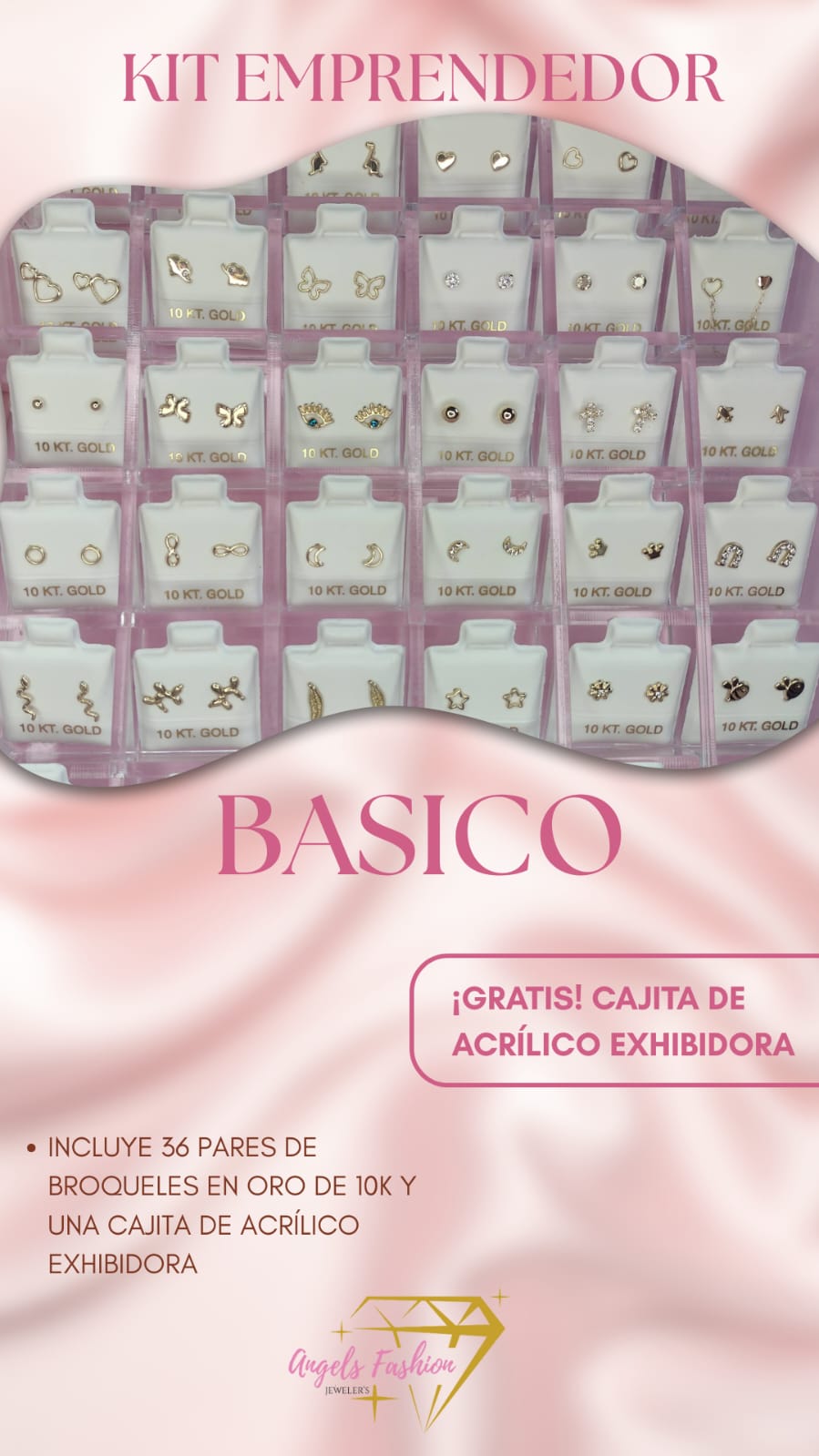 El Kit Emprendedor contiene 36 pares de broqueles de óptima calidad y una elegante cajita exhibidora de acrílico. Además, ofrece una variedad de diseños modernos (Los que se muestran en la foto) creados para atraer a los clientes.